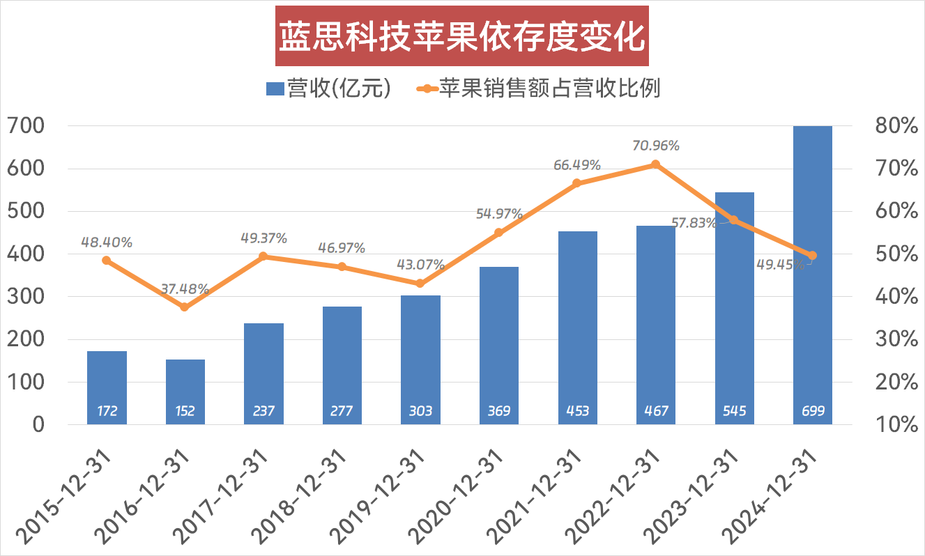 按照蓝思科技招股仿单及公开采访,周群飞1970年正在湖南省湘乡市壶天镇一个小山村出生,20世纪80年代末,未满20岁的周群飞前去深圳,进入一家玻璃厂打工,期间改良了多项玻璃加工工艺,为后续创业堆集了手艺经验。1993年,周群飞初次创业,和家人亲戚正在深圳开办了一家小型玻璃加工坊,一筚蓝缕,外行业里坐稳了脚跟,生意越来越好。2003年,周群飞成立深圳市蓝思科技无限公司(下称“深圳蓝思”),次要出产视窗防护玻璃。2004年,深圳蓝思研发的视窗防护玻璃率先使用于摩托罗拉V3手机并取得庞大成功。2006年,苹果公司的项目担任人率领团队“驻扎”正在蓝思科技,2007岁首年月,蓝思科技成功通过了苹果公司的供应商认证,两边正式成立合做关系,并合做至今。蓝思科技2015年上市招股书显示,2011年至2014年,对苹果公司的发卖额占公司昔时营收比例别离为54。02%、56。03%、40。12%、47。44%。而正在上市之后,该数据正在大部门年份也均维持正在40%以上,出格是2021年和2022年,别离达到66。49%、70。96%。